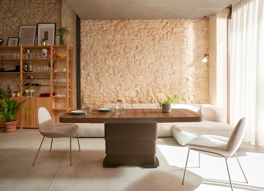 Mesa multifuncional de centro convertible en mesa de comedor, con pie metálico y sobre extensible con canto redondo o recto y acabados en chapa natural o melaminicos.