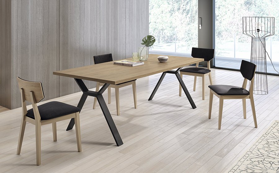 Mesa comedor fija o extensible, fabricación en chapa natural o melamina, con pata metálica.