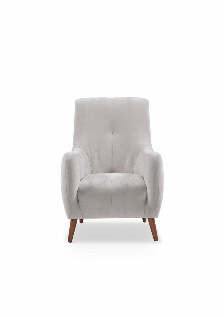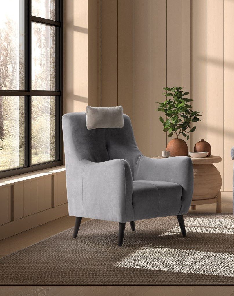 Su estructura estilizada con patas de madera aporta ligereza visual y calidez, permitiendo que encaje fácilmente en salones, dormitorios o rincones de lectura. El asiento amplio y el respaldo ergonómico proporcionan una sentada cómoda y estable, ideal para el uso diario.