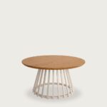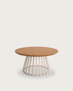 La mesa de centro Sahara de Bogal es una pieza que destaca por su diseño contemporáneo y elegante, ideal para quienes buscan un mueble funcional sin renunciar al estilo. Fabricada con materiales de alta calidad, esta mesa combina un tablero redondo de madera en acabado roble claro con una base metálica blanca en forma de rejilla cónica invertida, aportando ligereza visual y una estética moderna que encaja perfectamente en salones escandinavos, minimalistas o estilo Japandi.