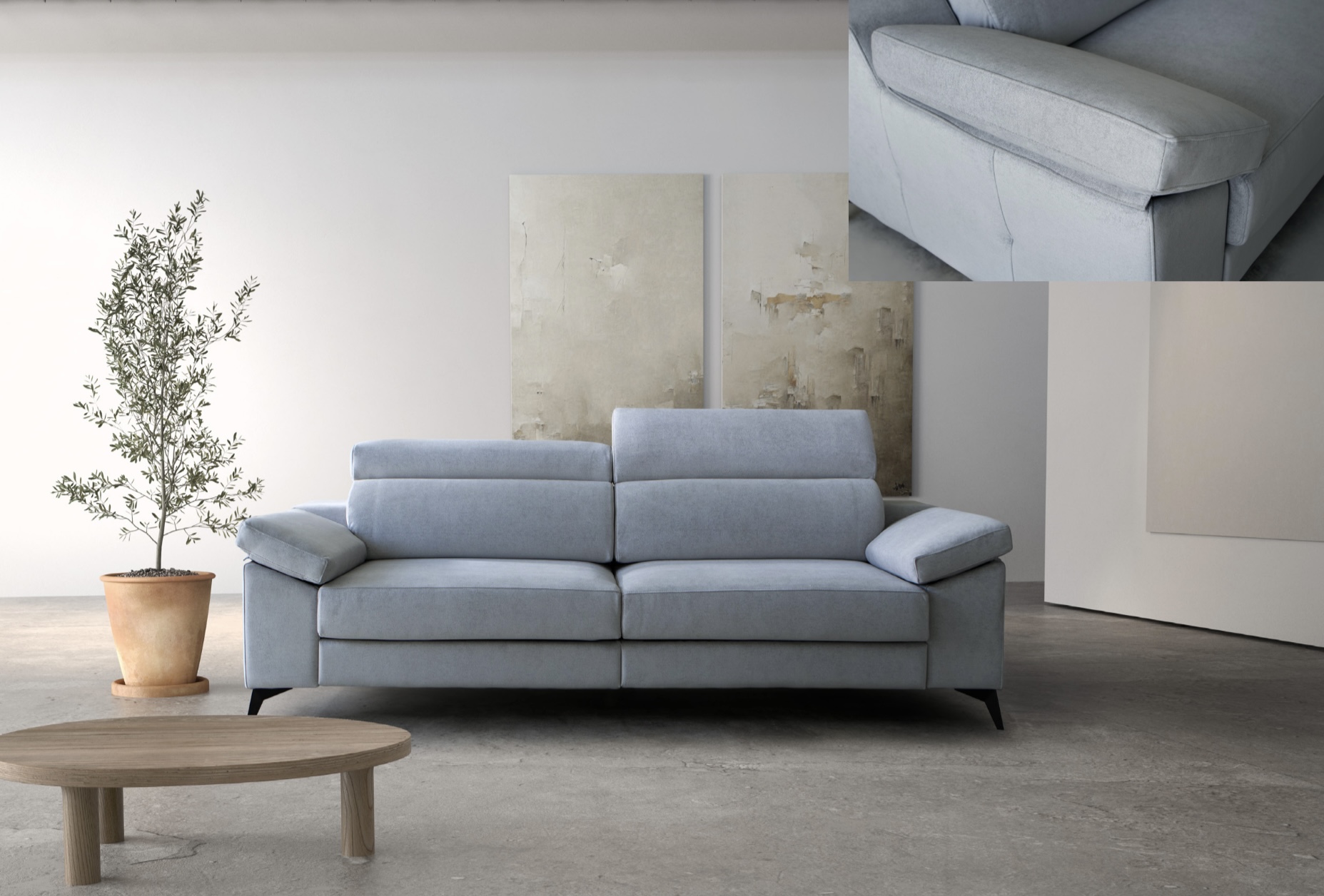 Uno de los grandes valores del sofá modelo Alpino es su sistema de confort avanzado. Incorpora espuma inyectada en riñonera, asientos y cabezales, proporcionando una sentada firme pero extremadamente cómoda. Esta espuma es de alta densidad, 50 kg/m³, lo que garantiza una excelente recuperación y resistencia al uso diario.